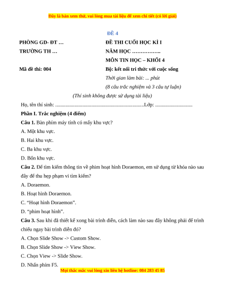 MÔN TIN HỌC – KHỐI 4 Mã đề thi: 004