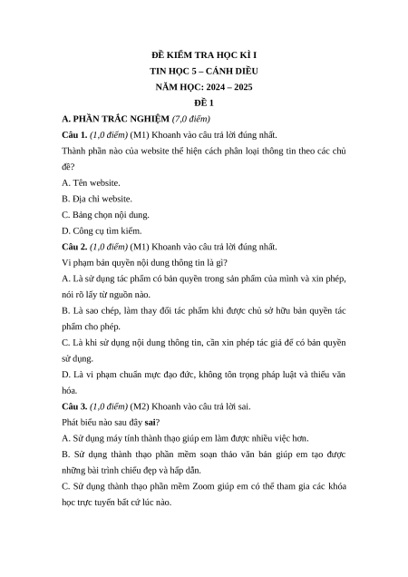 Đề thi Cuối kì 1 Tin học lớp 5 Cánh diều (Đề 1)