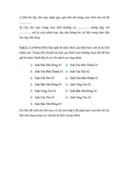 c) Đặt tên tệp, thư mục ngắn gọn, gợi nhớ nội dung, mục đích lưu trữ để ………….