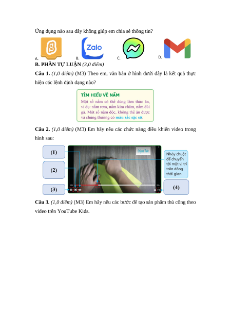 Câu 3. (1,0 điểm) (M3) Em hãy nêu các bước để tạo sản phẩm thủ công theo video trên YouTube Kids.