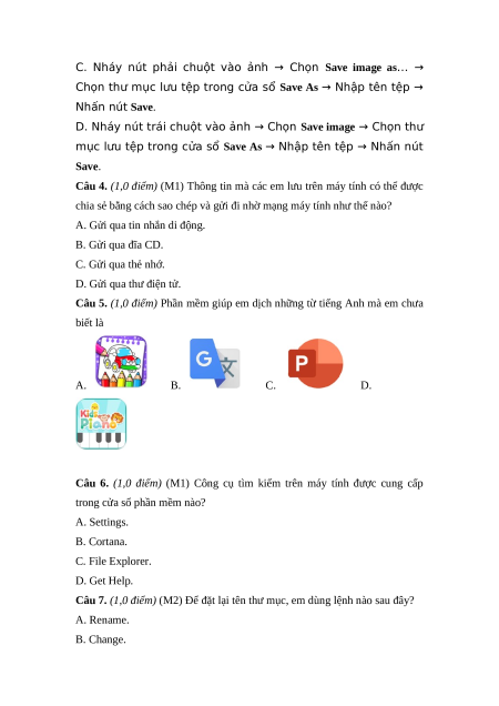 Câu 5. (1,0 điểm) Phần mềm giúp em dịch những từ tiếng Anh mà em chưa biết là A. B. C. D.