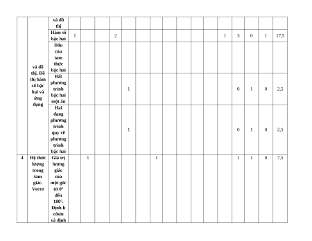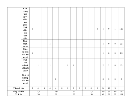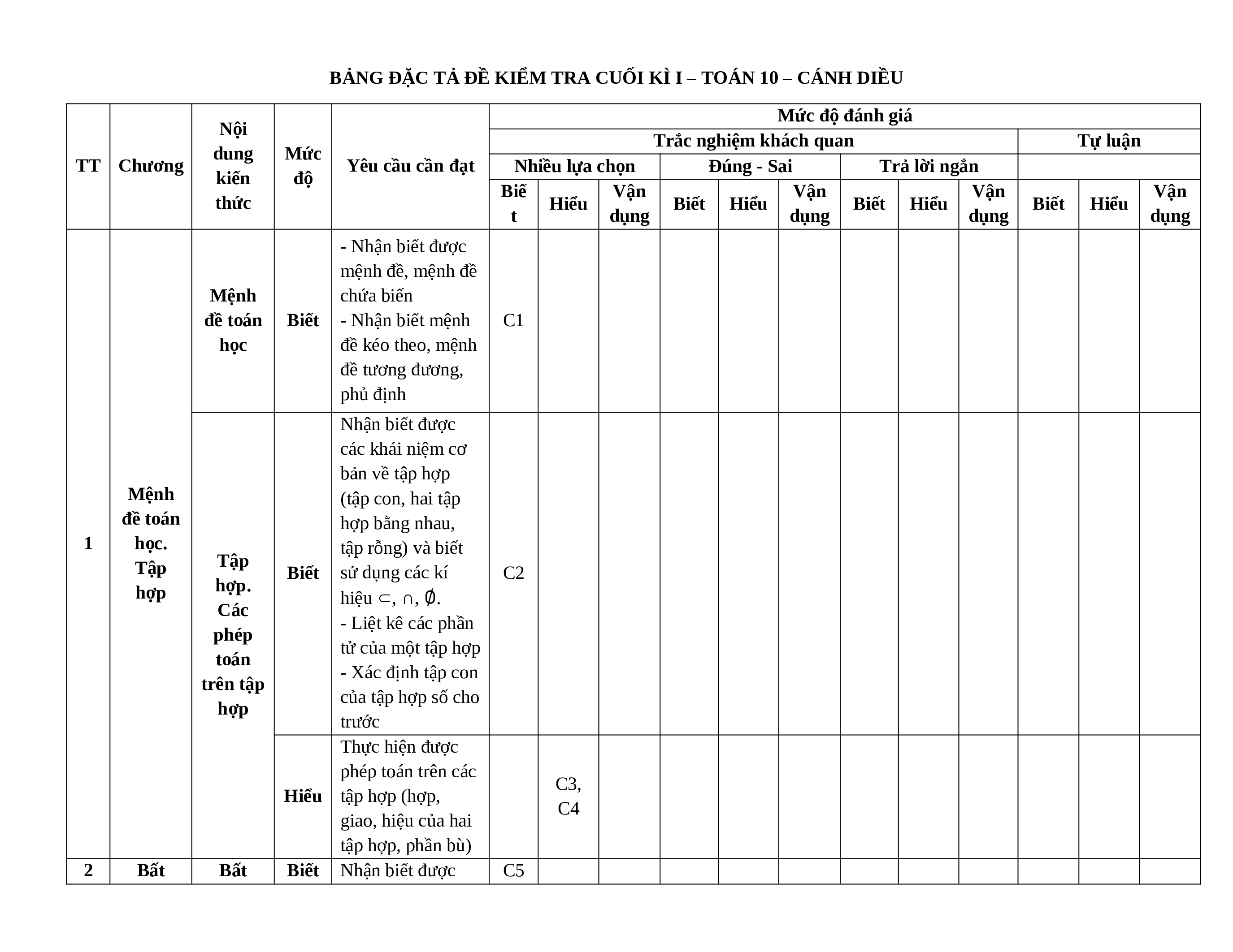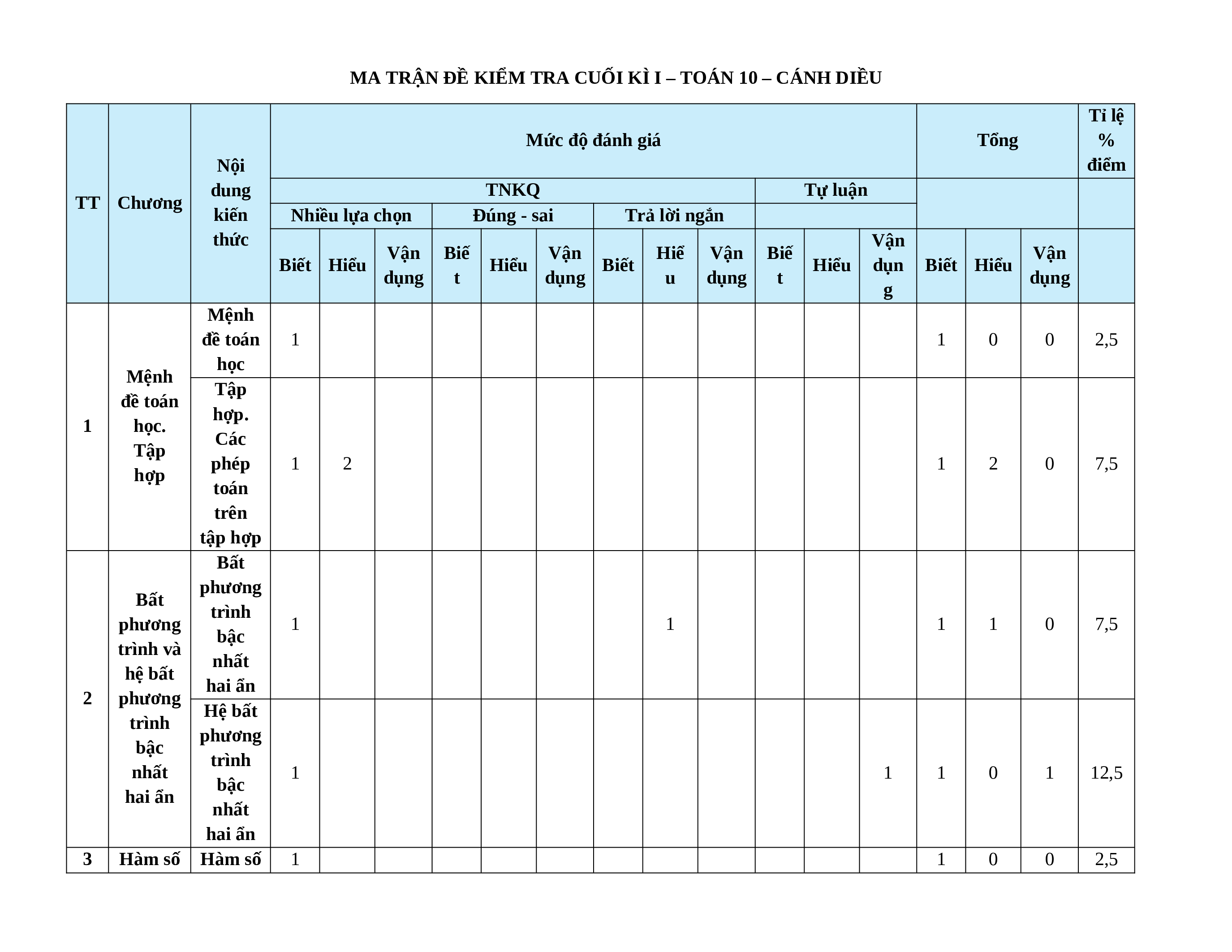 MA TRẬN ĐỀ KIỂM TRA CUỐI KÌ I – TOÁN 10 – CÁNH DIỀU Tỉ lệ Mức độ đánh giá Tổng % Nội điểm dung TNKQ Tự luận TT Chương kiến Nhiều lựa chọn Đúng - sai Trả lời ngắn thức Vận Vận Biế Vận Hiể Vận Biế Vận Biết Hiểu Hiểu Biết Hiểu dụn Biết Hiểu dụng t dụng u dụng t dụng g Mệnh đề toán 1 1 0 0 2,5 học Mệnh Tập đề toán hợp. 1 học. Các Tập phép 1 2 1 2 0 7,5 hợp toán trên tập hợp Bất phương Bất trình phương 1 1 1 1 0 7,5 bậc trình và nhất hệ bất hai ẩn 2 phương Hệ bất trình phương bậc trình nhất 1 1 1 0 1 12,5 bậc hai ẩn nhất hai ẩn 3 Hàm số Hàm số 1 1 0 0 2,5 và đồ thị Hàm số 1 2 1 3 0 1 17,5 bậc hai Dấu của tam thức và đồ bậc hai thị. Đồ Bất thị hàm phương số bậc trình 1 0 1 0 2,5 hai và bậc hai ứng một ẩn dụng Hai dạng phương trình 1 0 1 0 2,5 quy về phương trình bậc hai 4 Hệ thức Giá trị 1 1 1 1 0 7,5 lượng lượng trong giác tam của giác. một góc Vectơ từ 0° đến 180°. Định lí côsin và định lí sin trong tam giác Giải tam giác. Tính 1 1 1 0 1 12,5 diện tích tam giác Khái niệm 1 1 0 0 2,5 vectơ Tổng và hiệu 1 1 0 0 2,5 của hai vectơ Tích của một số 1 1 1 1 2 2 0 15 với một vectơ Tích vô hướng 2 0 2 0 5 của hai vectơ Tổng số câu 8 4 0 4 4 0 2 2 0 0 0 3 14 10 3 Tổng số điểm 3,0 2,0 2,0 3,0 4,0 3,0 3,0 10 Tỉ lệ % 30 20 20 30 40 30 30 100 Lưu ý: