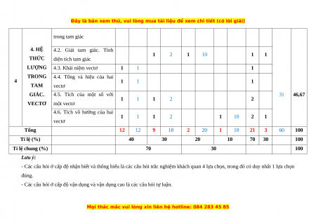 4.6. Tích vô hướng của hai 1 1 1 2 1 10 2 1 vectơ Tổng 12 12 9 18 2 20 1 10 21 3 60 100 Tỉ lệ (%) 40 30 20 10 70 30 100 Tỉ lệ chung (%) 70 30 100 Lưu ý: