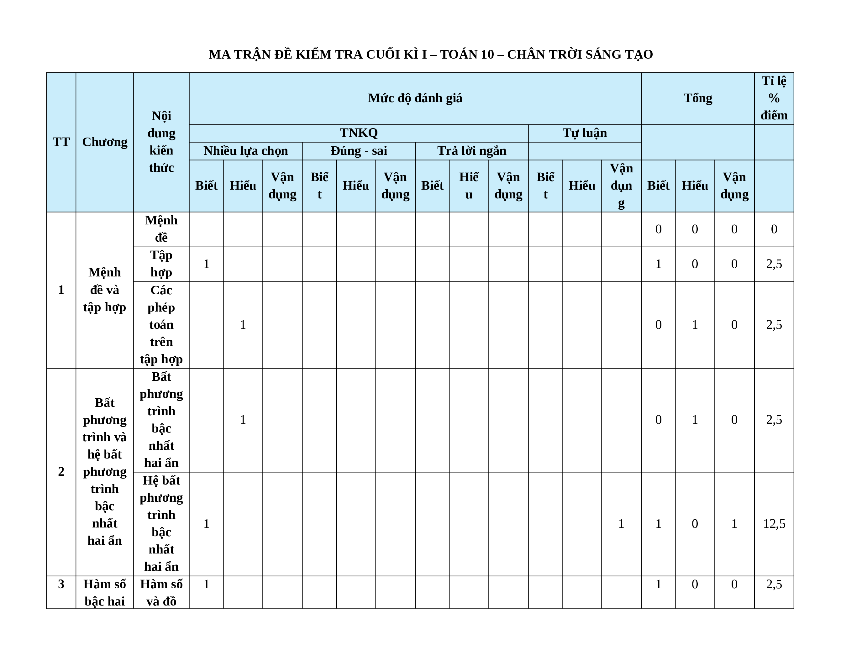 MA TRẬN ĐỀ KIỂM TRA CUỐI KÌ I – TOÁN 10 – CHÂN TRỜI SÁNG TẠO Tỉ lệ Mức độ đánh giá Tổng % Nội điểm dung TNKQ Tự luận TT Chương kiến Nhiều lựa chọn Đúng - sai Trả lời ngắn thức Vận Vận Biế Vận Hiể Vận Biế Vận Biết Hiểu Hiểu Biết Hiểu dụn Biết Hiểu dụng t dụng u dụng t dụng g Mệnh 0 0 0 0 đề Tập 1 1 0 0 2,5 Mệnh hợp 1 đề và Các tập hợp phép toán 1 0 1 0 2,5 trên tập hợp Bất phương Bất trình phương 1 0 1 0 2,5 bậc trình và nhất hệ bất hai ẩn 2 phương Hệ bất trình phương bậc trình nhất 1 1 1 0 1 12,5 bậc hai ẩn nhất hai ẩn 3 Hàm số Hàm số 1 1 0 0 2,5 bậc hai và đồ thị hàm và đồ số thị Hàm số 1 2 2 2 3 0 12,5 bậc hai Giá trị lượng giác của 1 1 1 1 0 7,5 một góc từ 0° đến Hệ thức 180° lượng Định lí 4 trong côsin tam 1 1 0 0 2,5 và định giác lí sin Giải tam giác và 1 0 0 1 10 ứng dụng thực tế Khái niệm 1 1 0 0 5 vectơ Tổng và hiệu 1 1 0 0 2,5 5 Vectơ của hai vectơ Tích của 1 1 1 1 0 7,5 một số với một vectơ Tích vô hướng 1 1 1 0 1 12,5 của hai vectơ 6 Thống Số gần kê đúng 0 0 0 0 và sai số Mô tả và biểu diễn dữ liệu 0 0 0 0 trên các bảng và biểu đồ Các số đặc trưng đo xu thế 0 0 0 0 trung tâm của mẫu số liệu Các số 1 2 2 1 3 3 0 17,5 đặc trưng đo độ phân tán của mẫu số liệu Tổng số câu 8 4 0 4 4 0 2 2 0 0 0 3 14 10 3 Tổng số điểm 3,0 2,0 2,0 3,0 4,0 3,0 3,0 10 Tỉ lệ % 30 20 20 30 40 30 30 100 Lưu ý: