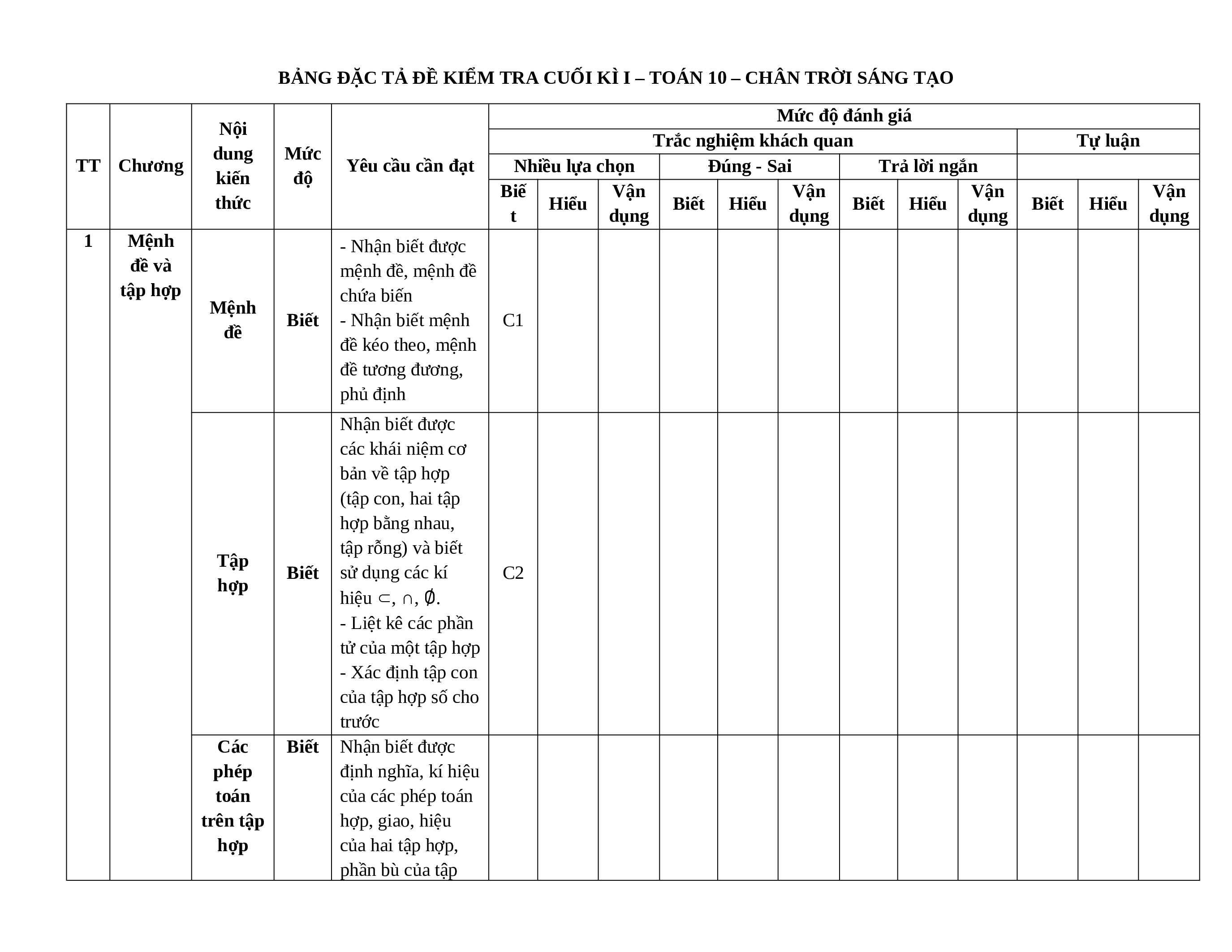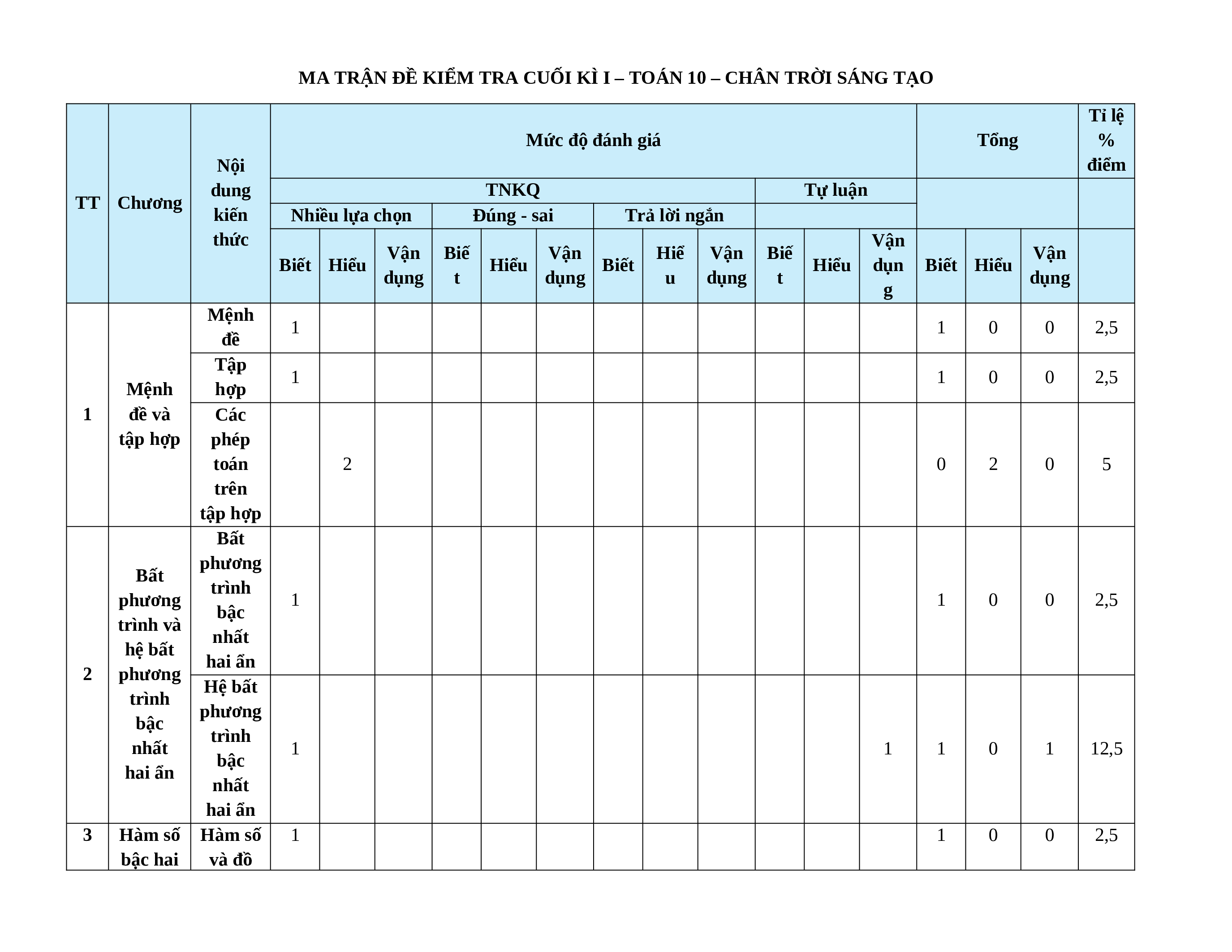 MA TRẬN ĐỀ KIỂM TRA CUỐI KÌ I – TOÁN 10 – CHÂN TRỜI SÁNG TẠO Tỉ lệ Mức độ đánh giá Tổng % Nội điểm dung TNKQ Tự luận TT Chương kiến Nhiều lựa chọn Đúng - sai Trả lời ngắn thức Vận Vận Biế Vận Hiể Vận Biế Vận Biết Hiểu Hiểu Biết Hiểu dụn Biết Hiểu dụng t dụng u dụng t dụng g Mệnh 1 1 0 0 2,5 đề Tập 1 1 0 0 2,5 Mệnh hợp 1 đề và Các tập hợp phép toán 2 0 2 0 5 trên tập hợp Bất phương Bất trình phương 1 1 0 0 2,5 bậc trình và nhất hệ bất hai ẩn 2 phương Hệ bất trình phương bậc trình nhất 1 1 1 0 1 12,5 bậc hai ẩn nhất hai ẩn 3 Hàm số Hàm số 1 1 0 0 2,5 bậc hai và đồ thị hàm và đồ số thị Hàm số 1 1 1 0 1 12,5 bậc hai Giá trị lượng giác của 1 1 1 1 0 7,5 một góc từ 0° đến Hệ thức 180° lượng Định lí 4 trong côsin tam 1 1 0 0 2,5 và định giác lí sin Giải tam giác và 1 0 0 1 10 ứng dụng thực tế Khái niệm 1 1 0 0 2,5 vectơ Tổng và hiệu 1 1 0 0 2,5 5 Vectơ của hai vectơ Tích của 1 1 1 1 2 2 0 15 một số với một vectơ Tích vô hướng 2 0 2 0 5 của hai vectơ 6 Thống Số gần kê đúng 1 0 1 0 5 và sai số Mô tả và biểu diễn dữ liệu 0 0 0 0 trên các bảng và biểu đồ Các số đặc trưng đo xu thế 1 0 1 0 2,5 trung tâm của mẫu số liệu Các số 2 1 2 1 0 7,5 đặc trưng đo độ phân tán của mẫu số liệu Tổng số câu 8 4 0 4 4 0 2 2 0 0 0 3 14 10 3 Tổng số điểm 3,0 2,0 2,0 3,0 4,0 3,0 3,0 10 Tỉ lệ % 30 20 20 30 40 30 30 100 Lưu ý: