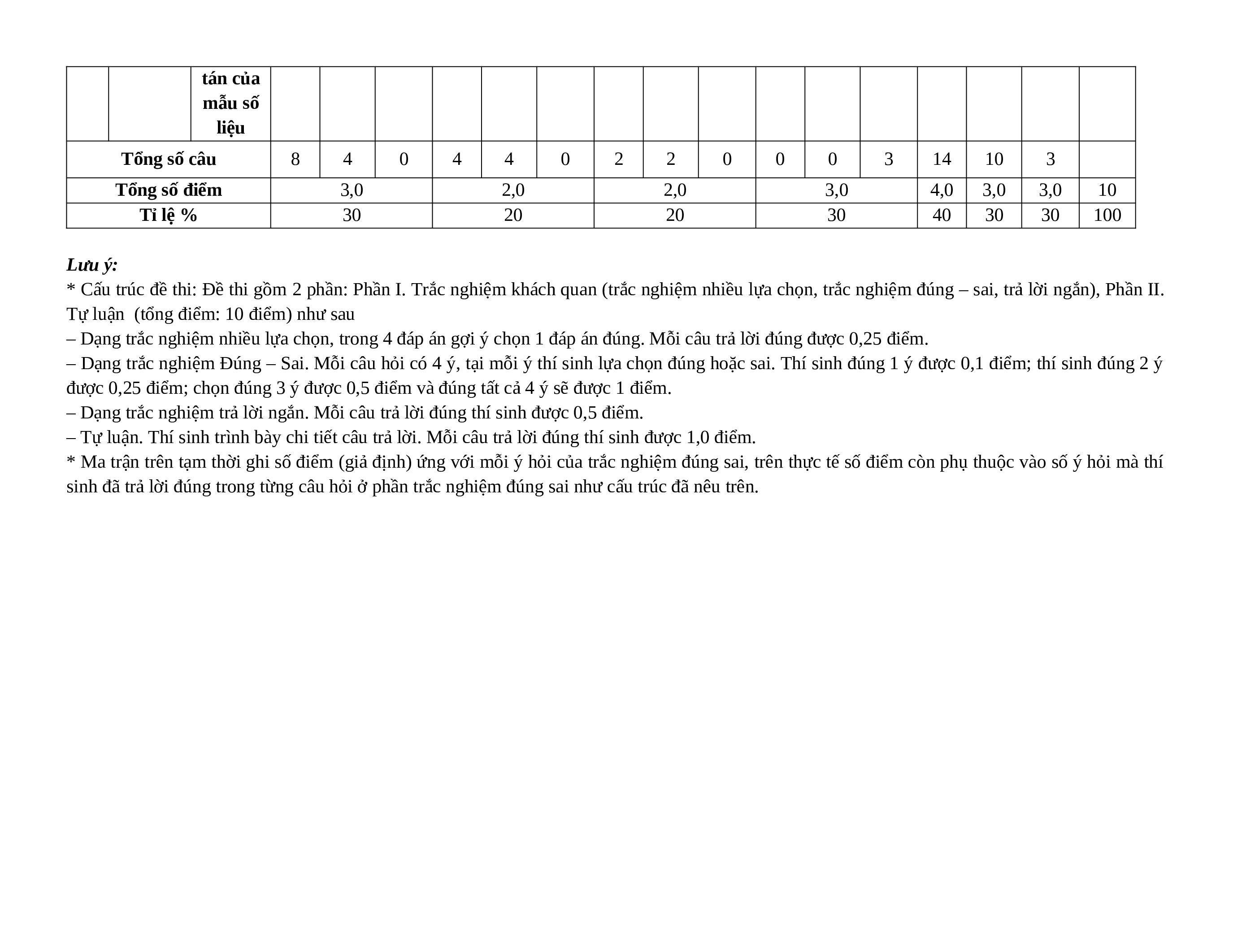 * Ma trận trên tạm thời ghi số điểm (giả định) ứng với mỗi ý hỏi của trắc nghiệm đúng sai, trên thực tế số điểm còn phụ thuộc vào số ý hỏi mà thí
