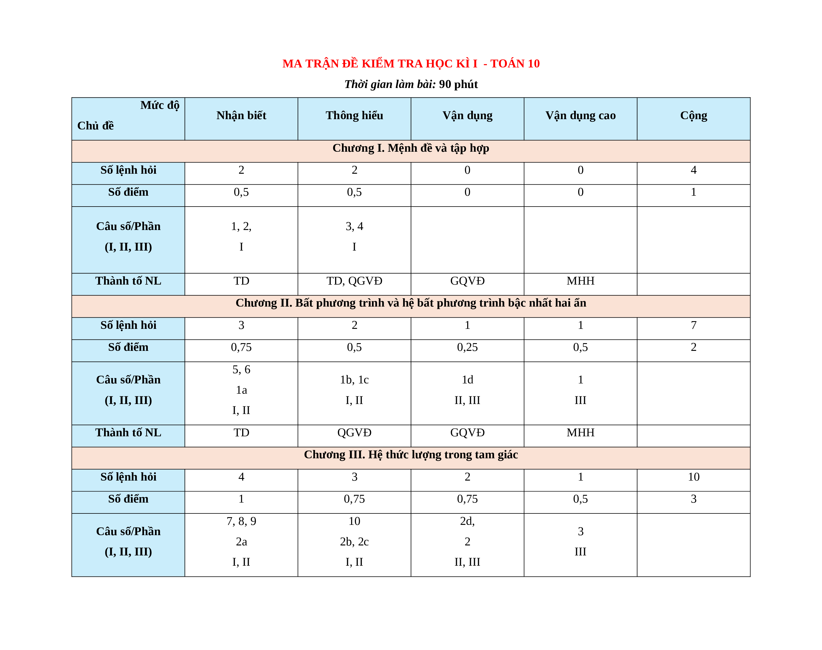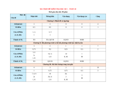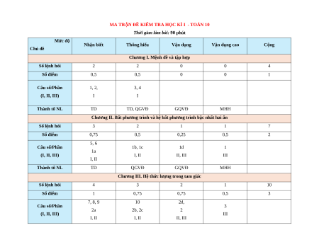 Chương III. Hệ thức lượng trong tam giác Số lệnh hỏi 4 3 2 1 10 Số điểm 1 0,75 0,75 0,5 3 7, 8, 9 10 2d, Câu số/Phần 3 2a 2b, 2c 2 (I, II, III) III I, II I, II II, III Thành tố NL TD QGVĐ GQVĐ MHH Chương IV. Vectơ Số lệnh hỏi 3 3 2 1 9 Số điểm 0,75 0,75 1 0,5 3 11 12 Câu số/Phần 4, 5 6 3a, 3b 3c, 3d, (I, II, III) III III I, II I, II Thành tố NL TD QGVĐ GQVĐ MHH