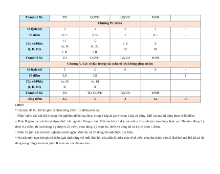 Chương V. Các số đặc trưng của mẫu số liệu không ghép nhóm Số lệnh hỏi 2 2 0 0 4 Số điểm 0,5 0,5 1 Câu số/Phần 4a, 4b 4c, 4d (I, II, III) II II Thành tố NL TD TD, QGVĐ GQVĐ MHH Tổng điểm 3,5 3 2 1,5 10 Lưu ý: