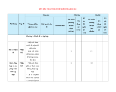 BẢN ĐẶC TẢ KĨ THUẬT ĐỀ KIỂM TRA HỌC KÌ I Năng lực Số ý/câu Câu hỏi TN TN TN nhiều TN nhiều TN trả TN trả phương phương Nội dung Cấp độ Tư duy và lập Giải quyết vấn đúng lời đúng lời Mô hình hóa án lựa án lựa luận toán học đề sai ngắn sai (số ngắn chọn chọn (số ý) (số ý) (số (số câu) (số câu) câu) câu)