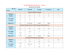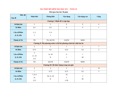 Chương III. Hệ thức lượng trong tam giác Số lệnh hỏi 4 3 2 1 10 Số điểm 1 0,75 0,75 0,5 3 7, 8, 9 10 Câu số/Phần 2b, 2c, 2d 3 2a 2 (I, II, III) II III I, II I, III Thành tố NL TD QGVĐ GQVĐ MHH Chương IV. Vectơ Số lệnh hỏi 3 3 2 1 9 Số điểm 0,75 0,75 1 0,5 3 11 12 Câu số/Phần 4, 5 6 3a, 3b 3c, 3d, (I, II, III) III III I, II I, II Thành tố NL TD QGVĐ GQVĐ MHH