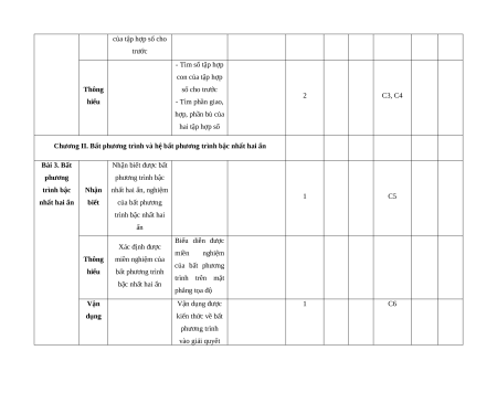 Chương I. Mệnh đề và tập hợp - Nhận biết được mệnh đề, mệnh đề chứa biến Bài 1. Mệnh Nhận - Nhận biết mệnh 1 C1 đề biết đề kéo theo, mệnh đề tương đương, phủ định Bài 2. Tập Nhận - Nhận biết được 1 C2 hợp và các biết phần tử thuộc hoặc phép toán không thuộc tập trên tập hợp hợp - Liệt kê các phần tử của một tập hợp - Xác định tập con của tập hợp số cho trước - Tìm số tập hợp con của tập hợp Thông số cho trước 2 C3, C4 hiểu - Tìm phần giao, hợp, phần bù của hai tập hợp số