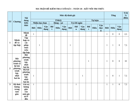 MA TRẬN ĐỀ KIỂM TRA CUỐI KÌ I – TOÁN 10 – KẾT NỐI TRI THỨC Tỉ lệ Mức độ đánh giá Tổng % Nội điểm dung TNKQ Tự luận TT Chương kiến Nhiều lựa chọn Đúng - sai Trả lời ngắn thức Vận Vận Biế Vận Hiể Vận Biế Vận Biết Hiểu Hiểu Biết Hiểu dụn Biết Hiểu dụng t dụng u dụng t dụng g Mệnh 1 1 0 0 2,5 đề Tập Mệnh hợp và 1 đề và các tập hợp phép 1 1 1 1 0 7,5 toán trên tập hợp Bất phương Bất trình phương 1 1 0 0 10 bậc trình và nhất hệ bất hai ẩn 2 phương Hệ bất trình phương bậc trình nhất 1 1 1 0 1 7,5 bậc hai ẩn nhất hai ẩn 3 Hệ thức Giá trị 1 1 1 1 0 7,5 lượng lượng trong giác tam của giác một góc từ 0° đến 180° Hệ thức lượng 1 1 1 1 2 1 1 17,5 trong tam giác Các khái 1 1 0 0 2,5 niệm mở đầu Tổng và hiệu 1 1 1 0 1 7,5 của hai vectơ Tích của một 1 1 1 2 1 0 7,5 vectơ 4 Vectơ với một số Vectơ trong mặt 1 1 0 1 1 12,5 phẳng tọa độ Tích vô hướng 1 0 1 0 2,5 của hai vectơ Các số Số gần đặc đúng 1 1 0 0 2,5 5 trưng và sai của số mẫu số Các số 3 0 3 0 7,5 đặc trưng đo xu thế trung tâm liệu Các số không đặc ghép trưng 1 1 0 2 0 5 nhóm đo độ phân tán Tổng số câu 8 4 0 2 6 0 1 1 2 1 0 2 12 11 4 Tổng số điểm 3,0 2,0 2,0 3,0 4,0 3,0 3,0 10 Tỉ lệ % 30 20 20 30 40 30 30 100 Lưu ý: