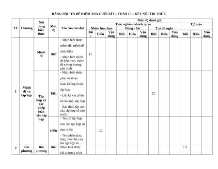 Trắc nghiệm khách quan Tự luận dung Mức TT Chương Yêu cầu cần đạt kiến độ Nhiều lựa chọn Đúng - Sai Trả lời ngắn thức Biế Vận Vận Vận Vận Hiểu Biết Hiểu Biết Hiểu Biết Hiểu t dụng dụng dụng dụng - Nhận biết được mệnh đề, mệnh đề Mệnh chứa biến Biết C1 đề - Nhận biết mệnh đề kéo theo, mệnh đề tương đương, phủ định - Nhận biết được phần tử thuộc hoặc không thuộc Mệnh tập hợp 1 đề và Biết C1 tập hợp Tập - Liệt kê các phần hợp và tử của một tập hợp các phép - Xác định tập con toán của tập hợp số cho trên tập trước hợp - Tìm số tập hợp con của tập hợp số Hiểu cho trước C2 - Tìm phần giao, hợp, phần bù của hai tập hợp số 2 Bất Bất Biết Nhận biết được C1 phương phương bất phương trình