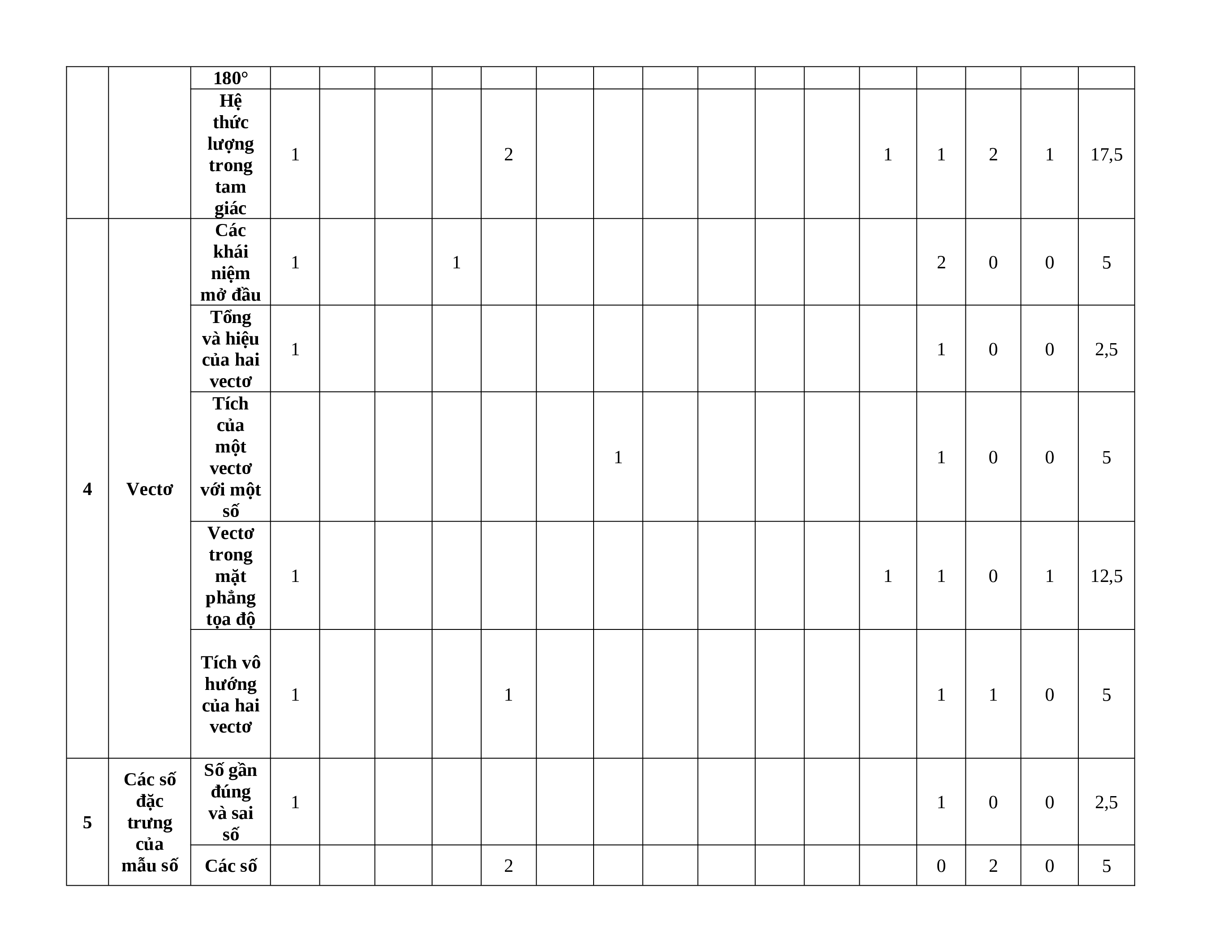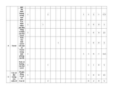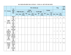 MA TRẬN ĐỀ KIỂM TRA CUỐI KÌ I – TOÁN 10 – KẾT NỐI TRI THỨC Tỉ lệ Mức độ đánh giá Tổng % Nội điểm dung TNKQ Tự luận TT Chương kiến Nhiều lựa chọn Đúng - sai Trả lời ngắn thức Vận Vận Biế Vận Hiể Vận Biế Vận Biết Hiểu Hiểu Biết Hiểu dụn Biết Hiểu dụng t dụng u dụng t dụng g Mệnh 1 1 0 0 2,5 đề Tập Mệnh hợp và 1 đề và các tập hợp phép 1 1 1 1 0 7,5 toán trên tập hợp Bất phương Bất trình phương 1 1 0 0 2,5 bậc trình và nhất hệ bất hai ẩn 2 phương Hệ bất trình phương bậc trình nhất 1 1 1 0 1 12,5 bậc hai ẩn nhất hai ẩn 3 Hệ thức Giá trị 1 1 1 1 0 7,5 lượng lượng trong giác tam của giác một góc từ 0° đến 180° Hệ thức lượng 1 2 1 1 2 1 17,5 trong tam giác Các khái 1 1 2 0 0 5 niệm mở đầu Tổng và hiệu 1 1 0 0 2,5 của hai vectơ Tích của một 1 1 0 0 5 vectơ 4 Vectơ với một số Vectơ trong mặt 1 1 1 0 1 12,5 phẳng tọa độ Tích vô hướng 1 1 1 1 0 5 của hai vectơ Các số Số gần đặc đúng 1 1 0 0 2,5 5 trưng và sai của số mẫu số Các số 2 0 2 0 5 đặc trưng đo xu thế trung tâm liệu Các số không đặc ghép trưng 1 1 1 1 2 2 0 12,5 nhóm đo độ phân tán Tổng số câu 12 0 0 2 6 0 1 3 0 0 0 3 15 9 3 Tổng số điểm 3,0 2,0 2,0 3,0 4,0 3,0 3,0 10 Tỉ lệ % 30 20 20 30 40 30 30 100 Lưu ý: