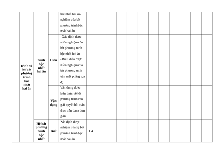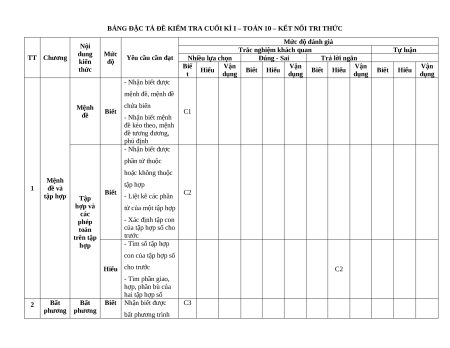Trắc nghiệm khách quan Tự luận dung Mức TT Chương Yêu cầu cần đạt kiến độ Nhiều lựa chọn Đúng - Sai Trả lời ngắn thức Biế Vận Vận Vận Vận Hiểu Biết Hiểu Biết Hiểu Biết Hiểu t dụng dụng dụng dụng - Nhận biết được mệnh đề, mệnh đề Mệnh chứa biến Biết C1 đề - Nhận biết mệnh đề kéo theo, mệnh đề tương đương, phủ định - Nhận biết được phần tử thuộc hoặc không thuộc Mệnh tập hợp 1 đề và Biết C2 tập hợp Tập - Liệt kê các phần hợp và tử của một tập hợp các phép - Xác định tập con toán của tập hợp số cho trên tập trước hợp - Tìm số tập hợp con của tập hợp số Hiểu cho trước C2 - Tìm phần giao, hợp, phần bù của hai tập hợp số 2 Bất Bất Biết Nhận biết được C3 phương phương bất phương trình