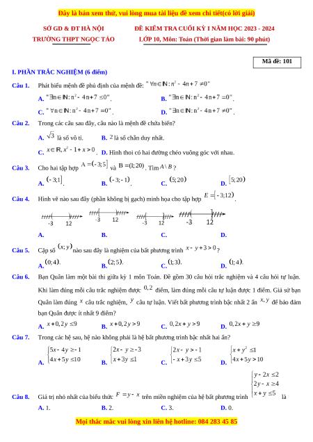 Đề thi cuối kì 1 Toán 10 năm 2024 trường THPT Ngọc Tảo - Hà Nội