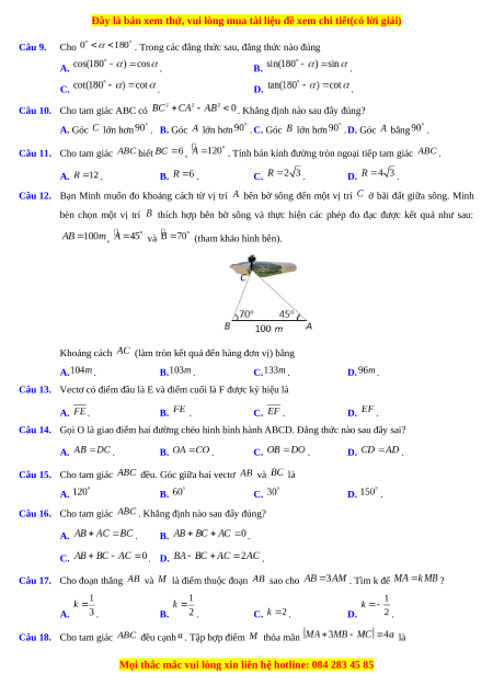 B. Một đường tròn. C. Một điểm. D. Một tia. Câu 19. Cho tam giác có ; , góc bằng . Tích vô hướng bằng A. B. . C. 10. D. 20.