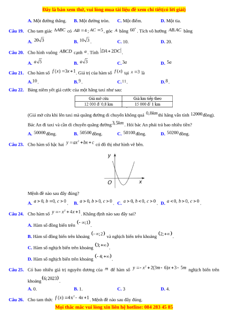 Câu 22. Bảng niêm yết giá cước của một hãng taxi như sau: