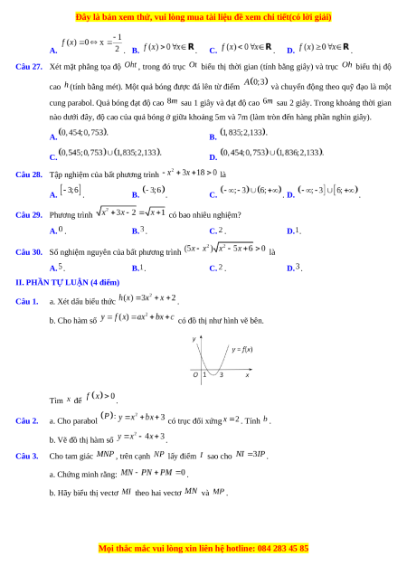 có đồ thị như hình vẽ bên. Tìm để . Câu 2. a. Cho parabol có trục đối xứng . Tính . b. Vẽ đồ thị hàm số . Câu 3. Cho tam giác , trên cạnh lấy điểm sao cho . a. Chứng minh rằng: . b. Hãy biểu thị vectơ theo hai vectơ và .