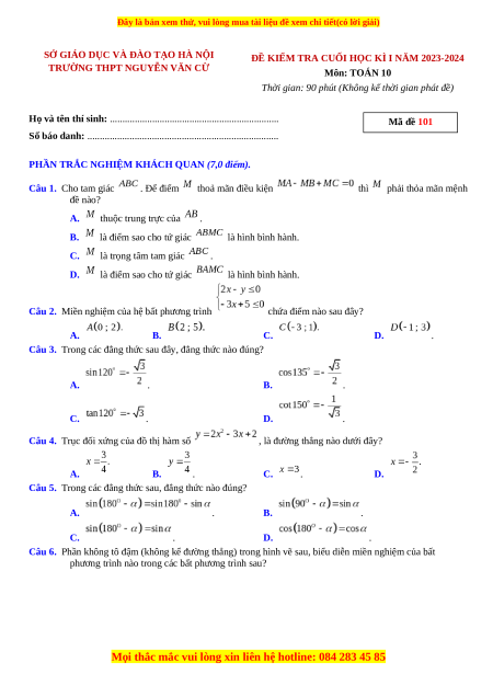 Đề thi cuối kì 1 Toán 10 năm 2024 trường THPT Nguyễn Văn Cừ - Hà Nội