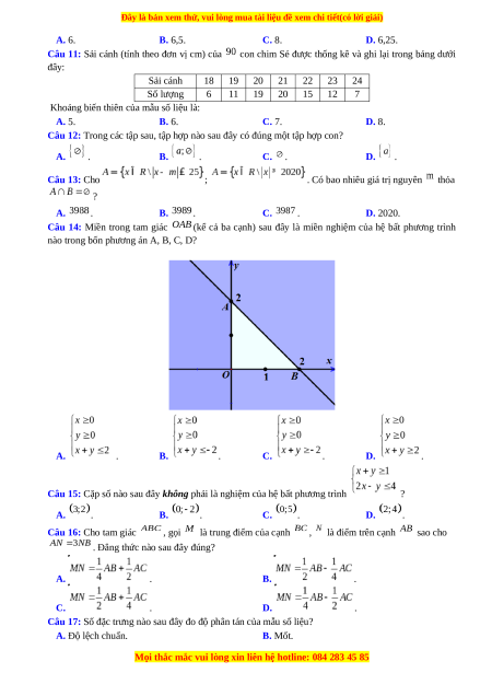 Câu 15: Cặp số nào sau đây không phải là nghiệm của hệ bất phương trình ? A. . B. . C. . D. . Câu 16: Cho tam giác , gọi