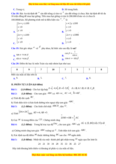 Câu 10: Điểm kiểm tra môn Toán của một nhóm gồm 10 học sinh như sau: .