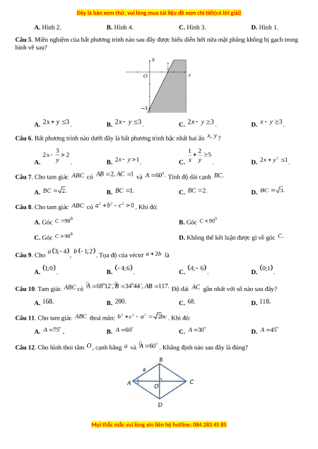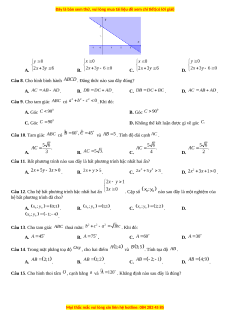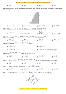 Câu 6. Bất phương trình nào dưới đây là bất phương trình bậc nhất hai ẩn ? A. . B. . C. . D. . Câu 7. Cho tam giác có và Tính độ dài cạnh A. B. C. D. Câu 8. Cho tam giác có . Khi đó: A. Góc B. Góc C. Góc