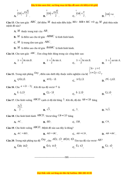 Câu 20. Trong mặt phẳng tọa độ , cho ,