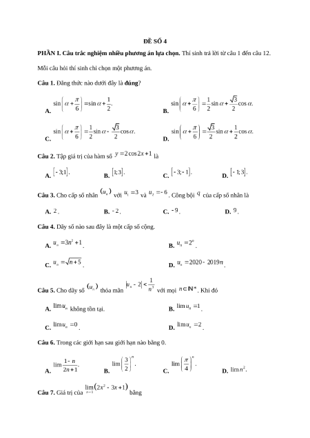 Câu 4. Dãy số nào sau đây là một cấp số cộng. A. . B. . C. . D. . Câu 5. Cho dãy số thỏa mãn với mọi . Khi đó A. không tồn tại. B. . C. . D. .
