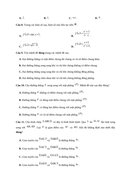 Câu 8. Trong các hàm số sau, hàm số nào liên tục trên . A. . B. . C. . D. .