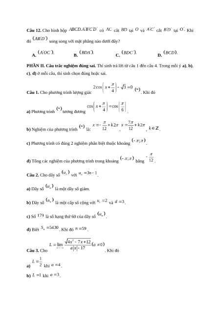 d) Tổng các nghiệm của phương trình trong khoảng bằng . Câu 2. Cho dãy số với . a) Dãy số là một dãy số giảm. b) Dãy số