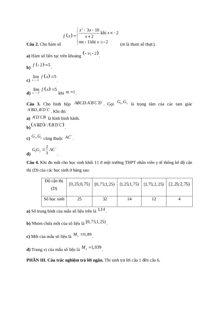 là số hạng thứ 11 của cấp số nhân. d) . Câu 2. Cho hàm số (m là tham số thực).