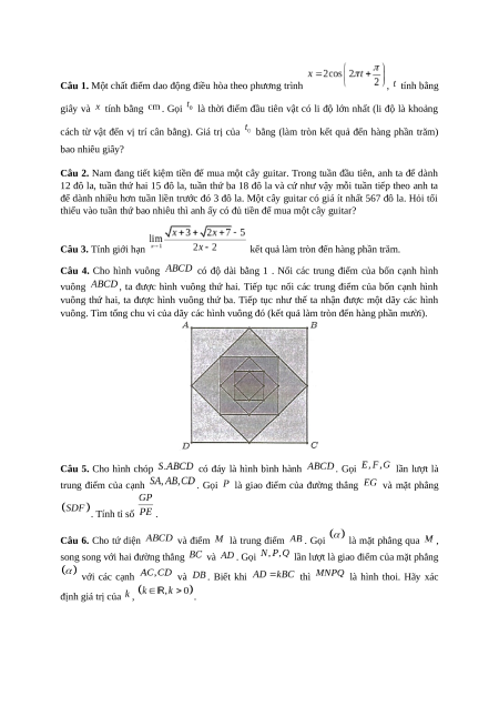Câu 1. Một chất điểm dao động điều hòa theo phương trình , tính bằng giây và tính bằng