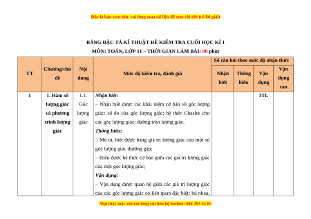 BẢNG ĐẶC TẢ KĨ THUẬT ĐỀ KIỂM TRA CUỐI HỌC KÌ 1