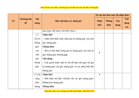 Mức độ kiểm tra, đánh giá Nhận Thông Vận đề dung dụng biết hiểu dụng cao 1 1. Hàm số 1.1. Nhận biết: 1TL lượng giác Góc