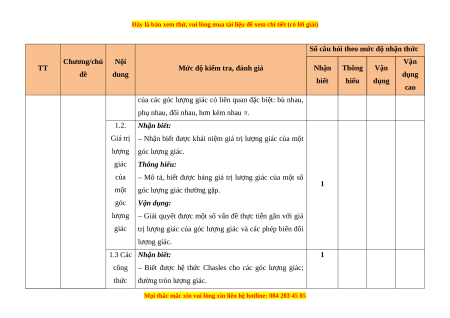 Mức độ kiểm tra, đánh giá Nhận Thông Vận đề dung dụng biết hiểu dụng cao 1 1. Hàm số 1.1. Nhận biết: 1TL lượng giác Góc