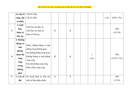 cộng, cấp Cấp số nhân (1,0) (4TN, 1TL) số nhân 3. Giới Giới hạn của dãy số hạn. 20% 3 Giới hạn của hàm số 6 4 Hàm số (10 TN) Hàm số liên tục liên tục 4. Đường