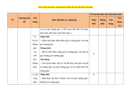 Mức độ kiểm tra, đánh giá Nhận Thông Vận đề dung dụng biết hiểu dụng cao 1 1. Hàm số 1.1. Nhận biết: 1TL lượng giác Góc