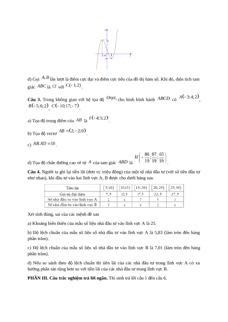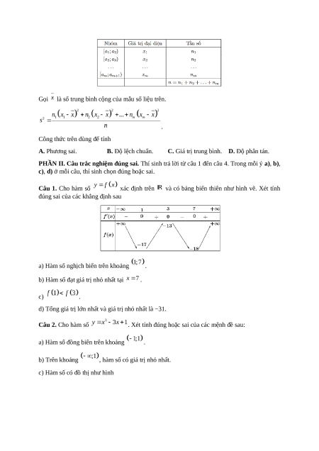 c), d) ở mỗi câu, thí sinh chọn đúng hoặc sai. Câu 1. Cho hàm số