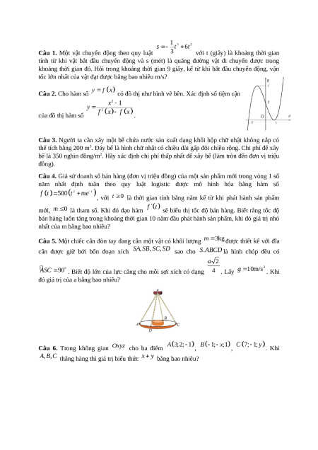 Câu 4. Đồ thị như hình vẽ là của hàm số A. . B. . C. . D. . Câu 5. Hàm số