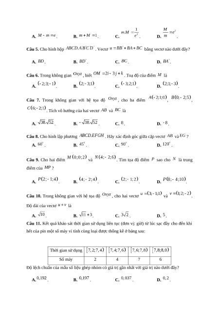 Câu 10. Trong không gian với hệ tọa độ , cho hai vectơ và . Độ dài của vectơ là A. . B. . C. . D. .