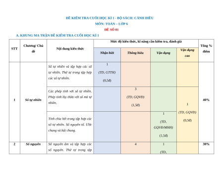 ĐỀ KIỂM TRA CUỐI HỌC KÌ 1 - BỘ SÁCH: CÁNH DIỀU MÔN: TOÁN – LỚP 6 ĐỀ SỐ 01