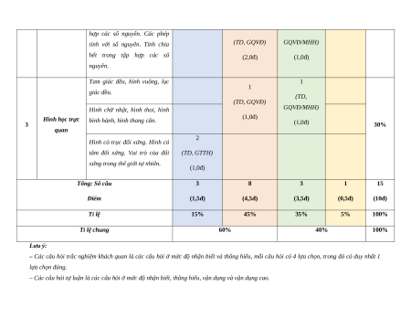 Tổng: Số câu 3 8 3 1 15 Điểm (1,5đ) (4,5đ) (3,5đ) (0,5đ) (10đ) Tỉ lệ 15% 45% 35% 5% 100% Tỉ lệ chung 60% 40% 100% Lưu ý: