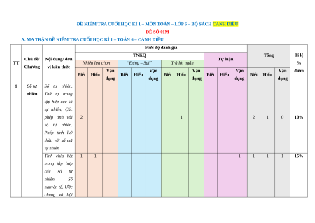 A. MA TRẬN ĐỀ KIỂM TRA CUỐI HỌC KÌ 1 – TOÁN 6 – CÁNH DIỀU Mức độ đánh giá TNKQ Tổng Tỉ lệ