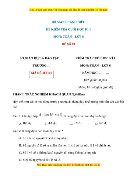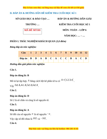 KIỂM TRA CUỐI HỌC KÌ 1 TRƯỜNG … MÔN: TOÁN – LỚP 6 MÃ ĐỀ MT101 NĂM HỌC: … – … Thời gian: 90 phút