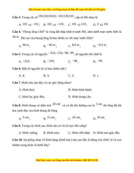 Câu 6. Một số nguyên tố có bao nhiêu ước? A. 4; B. 3; C. 2; D. 1.