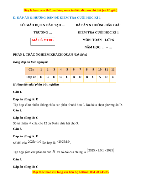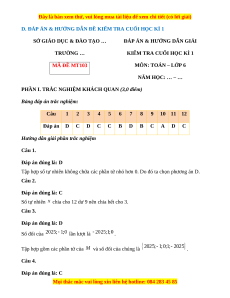 KIỂM TRA CUỐI HỌC KÌ 1 TRƯỜNG … MÔN: TOÁN – LỚP 6 MÃ ĐỀ MT103 NĂM HỌC: … – … Thời gian: 90 phút