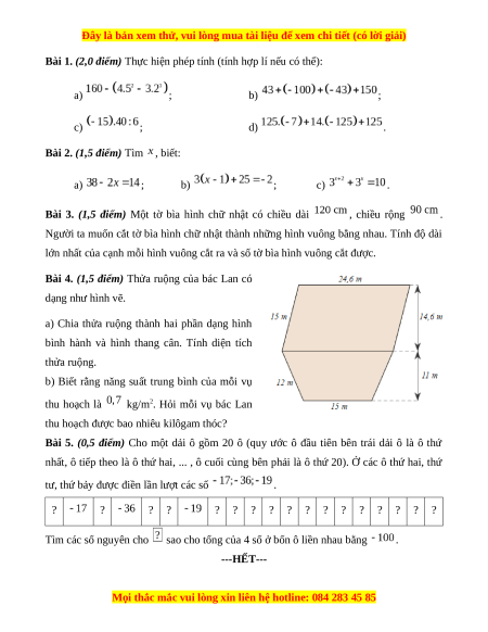 Bài 4. (1,5 điểm) Thửa ruộng của bác Lan có dạng như hình vẽ.