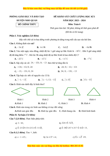 NĂM HỌC 2023 – 2024 ĐỀ CHÍNH THỨC Môn: Toán 6