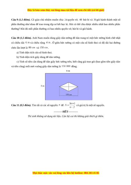 Câu 10 (1,5 điểm). Anh Nam muốn dùng giấy dán tường để dán trang trí một bức tường hình chữ nhật có chiều dài và chiều rộng